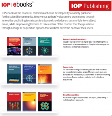IOP Publishing은 세계적으로 물리학계를 주도하는 영국물리학회의 저널을 출판하고 있으며, 50,000여 물리학 관련 교수 및 연구원들이 회원으로 가입되어 있고, 물리학, 의학, 응용물리, 핵물리학, 광학, 원자력 물리분야의 최신 연구 및 동향 정보를 제공하고 있습니다. 최근에는 IOP science 라는 새로운 플랫폼을 선보이며, 정확하고 빠른 검색을 통하여 이용자들의 검색시간을 절약, 원하는 정보를 바로 찾을 수 있도록 도와주고 있습니다