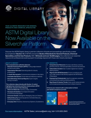 ASTM International은 1898년 American Society for Testing and Materials로 설립되었으며, 12,000개 이상의 표준으로 제품 품질을 개선하고, 안전과 시장 접근성 및 무역을 강화합니다. 140개국을 대표하는 세계 최고의 기술 전문가와 비즈니스 전문가 30,000명 이상의 회원을 보유하고 있으며, 나노 기술, 적층 제조, 산업 생명공학 등의 새로운 산업과 기술의 발전에 기여합니다. 항공우주, 생물의학, 화학, 토목, 환경, 지질, 건강 및 안전, 산업, 재료 과학, 기계, 핵, 석유, 토양 과학, 태양열 공학을 포함한 광범위한 엔지니어링 분야를 포괄하는 Journals, Proceedings, e-Books를 제공합니다.